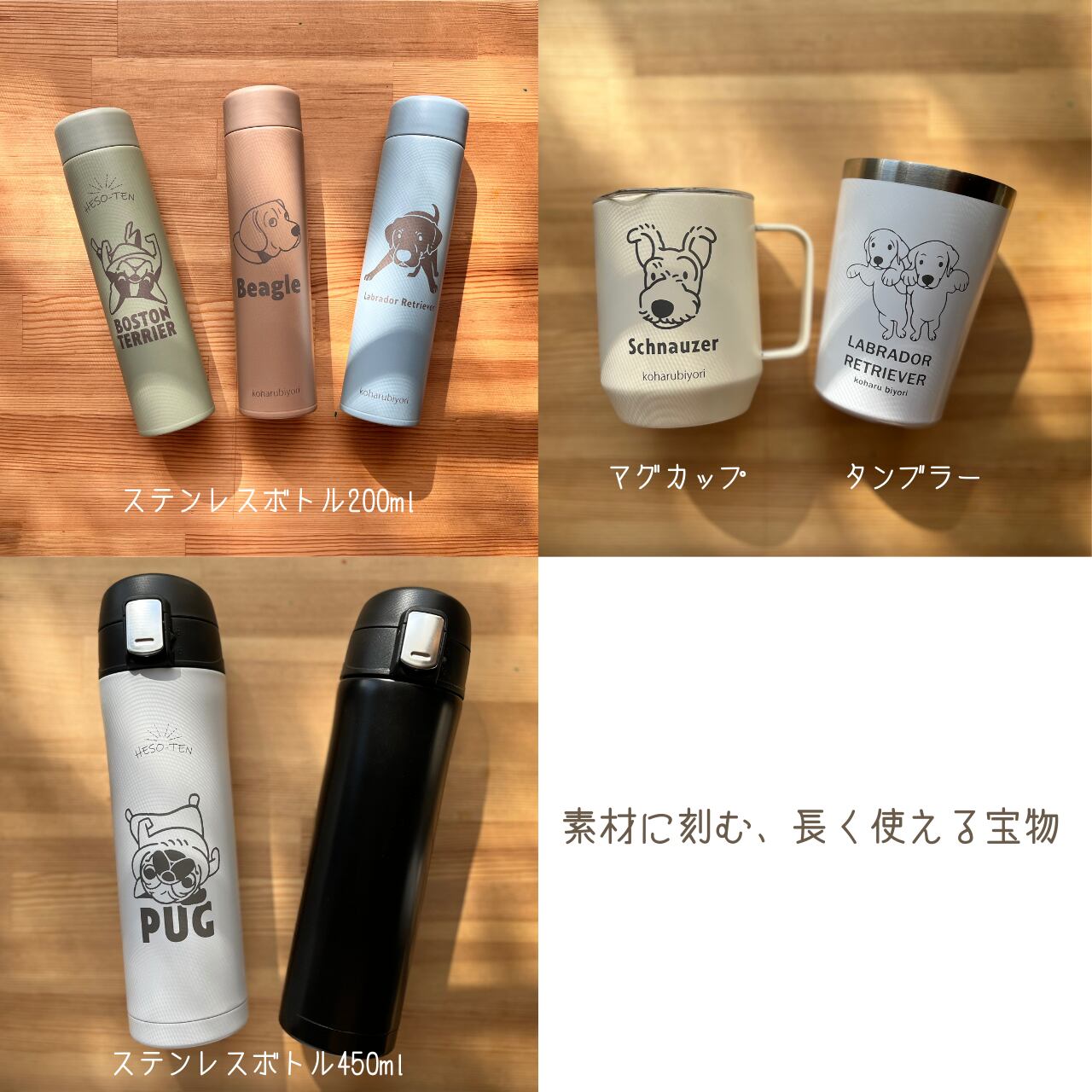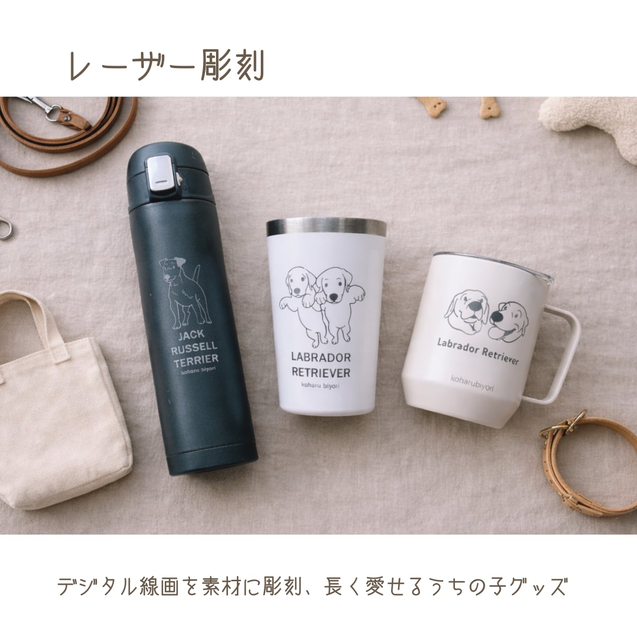 2. 【レーザー彫刻】:素材に直接刻印。剥がれる心配が少なく、ボトルのような「実用グッズ」でいつでもうちの子と一緒にいたい方に。